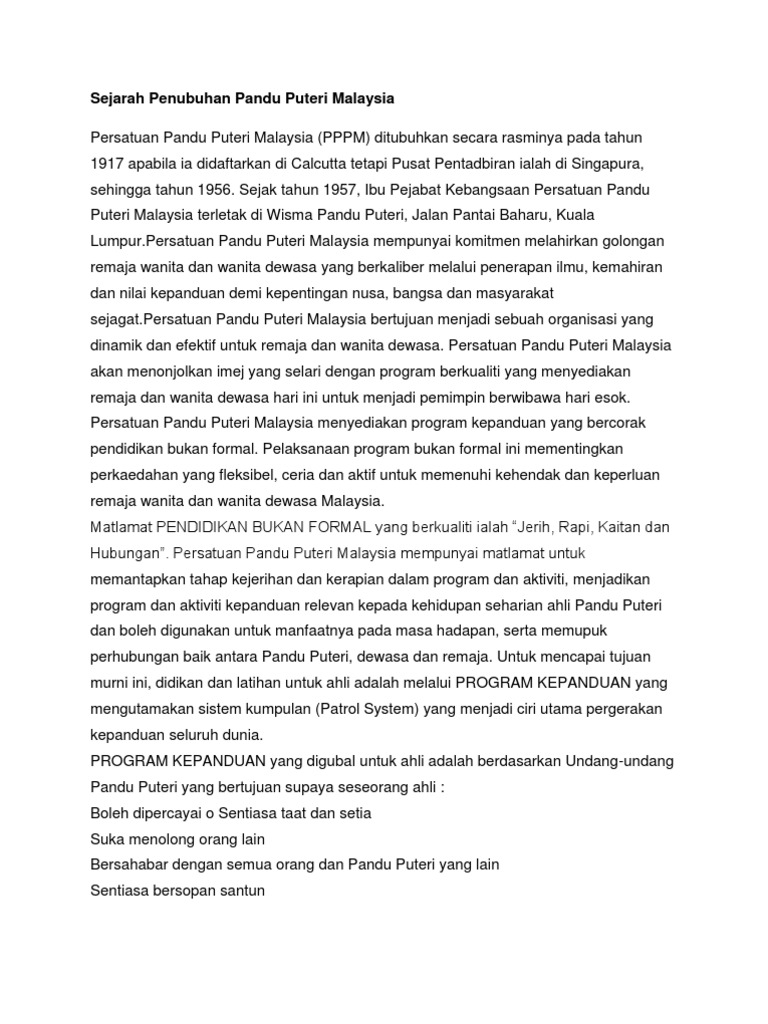 Pandu puteri bermula di kuala lumpur pada tahun 1916 dan pada tahun 1917 persatuan pandu puteri semenjak tahun 1928 persatuan pandu puteri malaysia telah menerima pengiktirafan dan sokongan daripada menjadi penggerak utama dalam rangkaian pertubuhan bukan kerajaan (belia). Kemudian, pada perjumpaan kedua pula, diterangkan dengan logo, sejarah, pakaian, lagu dan perlembagaan khusus mengenai unit. Perlembagaan pertubuhan kebangsaan melayu bersatu merupakan dokumen yang digunapakai oleh pertubuhan kebangsaan melayu bersatu (umno) dan diluluskan oleh jabatan pendaftaran pertubuhan. Persatuan pandu puteri malaysia perlembagaan pertubuhan. Lencana pandu puteri malaysia di tengah latar biru membawa maksud matahari menyinari setiap kanak kanak di dunia. Persatuan pandu puteri malaysia bertujuan menjadi sebuah organisasi yang dinamik dan efektif untuk remaja dan wanita dewasa. Sumpah pemohon bagi pendaftaran atau penaturalisasian. Alamat tempat urusan tidak boleh tanpa mendapat kebenaran dari pendaftaran pertubuhan terlebih dahulu. Pertubuhan ini bernama pertubuhan kebajikan dan dakwah islamiah malaysia atau pekida malaysia. Persatuan pandu puteri memberi paduan guru untuk mengetahui, memahami kaedah, srtategi dan prinsip pengurusan badan beruniform secara berkesan. Pasukan elit kawad kaki pandu puteri smk kota masai 2, pasir gudang, johor. Akhirnya, perwakilan persidangan dari 26 negara membuat keputusan untuk membentuk persatuan pandu puteri dan pengakap puteri sedunia. Satu draf perlembagaan telah disetujui dan pandu puteri menjadi satu persatuan yang berpusat.